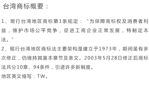 申请人主体资格:任何自然人和法人都可申请注册商标。在台湾地区无住所或营业所者,应委任商标代理人办理商标注册申请。
